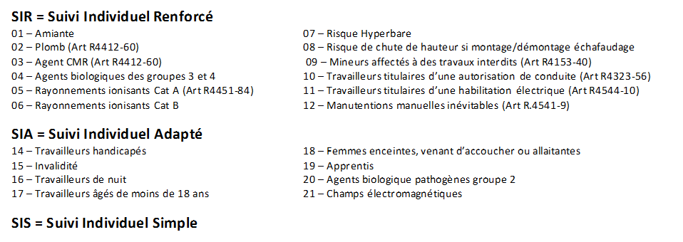 Afin que le suivi individuel des salariés que nous prenons en charge soit assuré en cohérence avec leurs expositions professionnelles et situations personnelles, il est central que leur déclaration auprès de nous soit faite dans la bonne catégorie : SIS (suivi individuel simple), SIA (suivi individuel adapté) ou SIR (suivi individuel renforcé). Votre équipe santé-travail de proximité est à votre écoute pour vous conseiller à ce sujet :